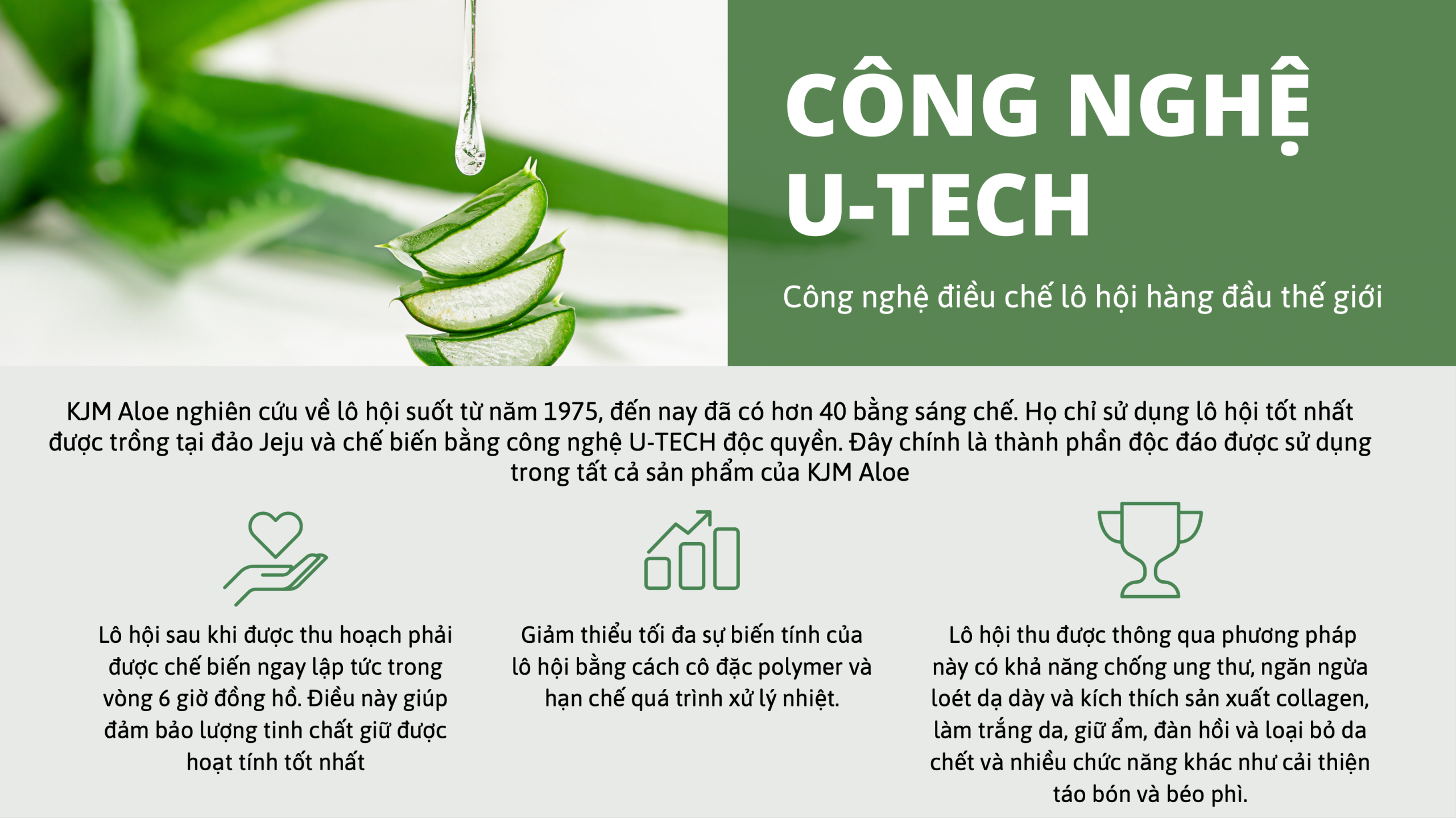 KJM Aloe nghiên cứu về lô hội suốt từ năm 1975, đến nay đã có hơn 40 bằng sáng chế. Họ chỉ sử dụng lô hội tốt nhất được trồng tại đảo Jeju và chế biến bằng công nghệ U-TECH độc quyền. Đây chính là thành phần độc đáo được sử dụng trong tất cả sản phẩm của KJM Aloe.