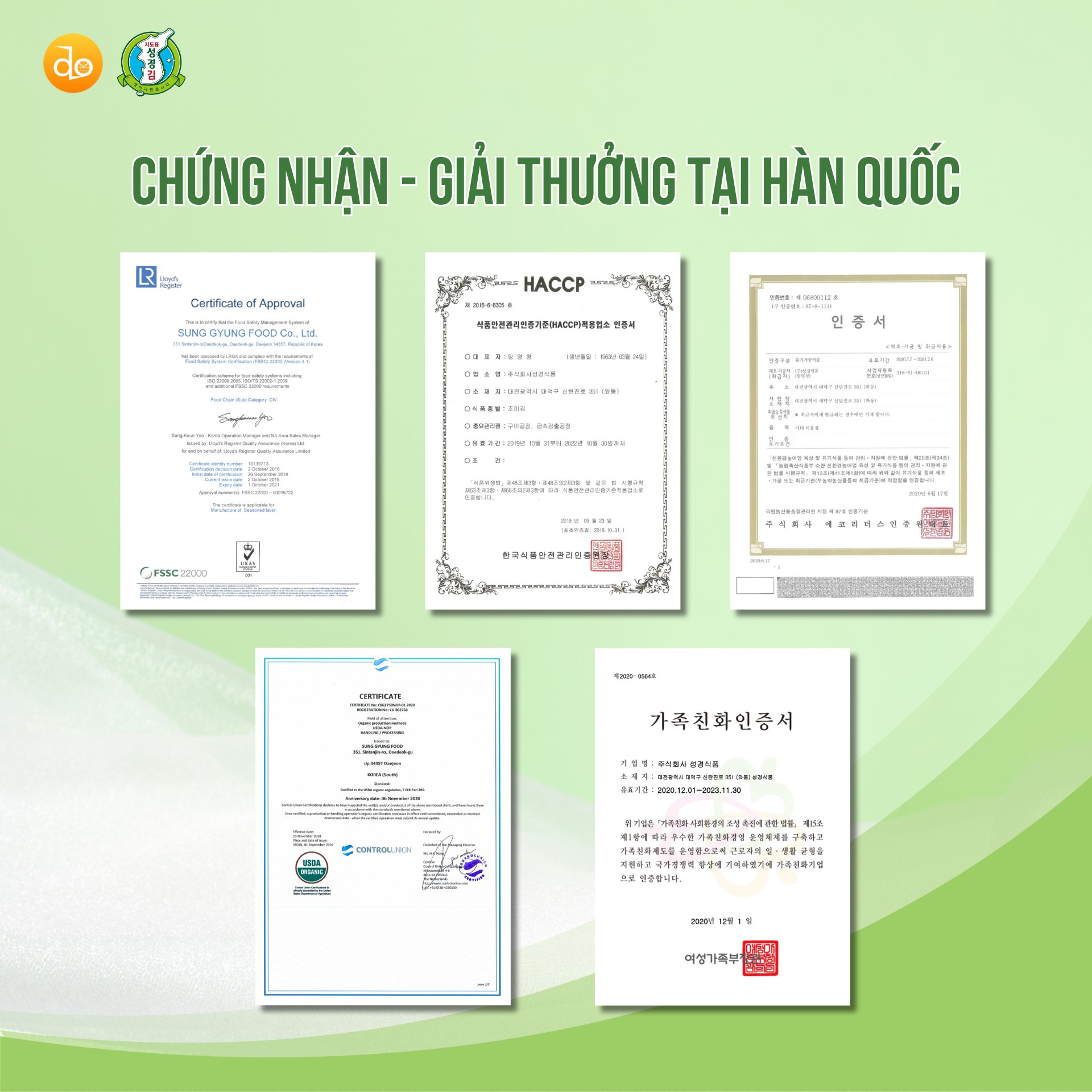 Sản phẩm của Sung Gyung đã nhận được nhiều chứng nhận quốc tế như: